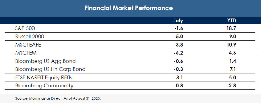 Every month this year has brought major events for investors to digest, and August was no different. The month started with Fitch downgrading the United States’ credit rating to AA+ from the top-quality AAA rating. The rating agency cited “rising debt burdens” and “erosion of governance” among the key drivers behind the decision.[1] While this creates noise in the short-term, historically it has not impacted longer-term asset class returns. Ultimately, most asset classes did end the month lower. Rising rates were a main driver of the lackluster results across asset classes. Favorable economic data and more positive sentiment on the potential for a soft landing, coupled with a Federal Reserve that is willing to stay higher-for-longer, fueled the interest rate move higher.