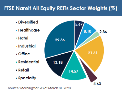 The post-pandemic hybrid and work-from-home environment has pressured the office market as investors ponder the uncertainty of future demand. However, the office sector accounts for only a fraction of the real estate market. Office is less than five percent of the publicly traded REIT market. The private real estate market has a larger weight to office