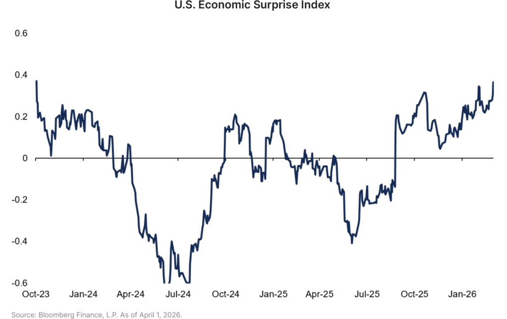 On balance, we see genuine reasons for measured optimism. Earnings growth is broadening, powered by AI and defense spending. The Bloomberg Economic Surprise Index sits near its highest level since 2023, and shelter costs, a stubborn driver of core inflation, continue to moderate. Critically, a soft labor market reduces pressure on the Fed to respond high inflation driven by energy prices. Collectively, these conditions buy time for a diplomatic resolution and create the backdrop under which one can succeed.