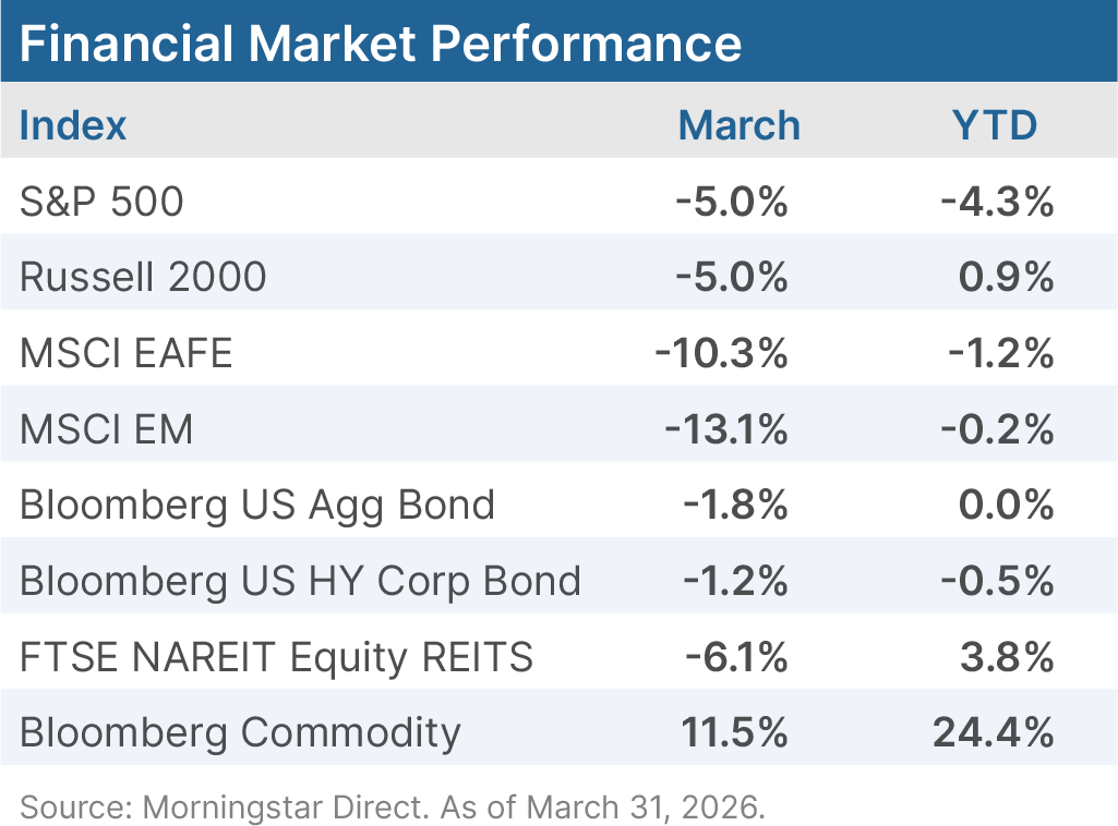 Bond markets offered modest stability. The Bloomberg US Aggregate Bond Index was flat, TIPS rose 0.3%, and high yield bonds dipped just 0.5%, cushioned by income. Rates climbed through the quarter on inflation concerns tied to higher energy prices. Markets have largely erased expectations for a Fed cut in 2026, a sentiment we think may be overdone in the short-term.